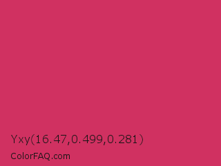 Yxy 16.47,0.499,0.281 Color is a normal rose color and the nearest color is Cerise Red #de3163. Hex code #d03161 and RGB value is rgb(208,49,97). In RGB color space, this color is composed of 82% red, 19% green, 38% blue, In CMYK color space, this color is composed of 0% cyan, 76% magenta, 53% yellow , 18% black , In HSL color space, this color has a hue angle of 342° , 63% saturation and 50% lightness.