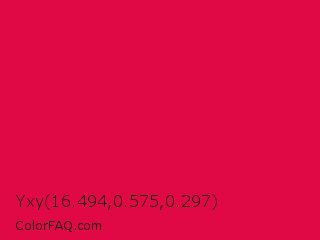 Yxy 16.494,0.575,0.297 Color is a normal rose color and the nearest color is UA Red #d9004c. Hex code #e00945 and RGB value is rgb(224,9,69). In RGB color space, this color is composed of 88% red, 4% green, 27% blue, In CMYK color space, this color is composed of 0% cyan, 96% magenta, 69% yellow , 12% black , In HSL color space, this color has a hue angle of 343° , 92% saturation and 46% lightness.