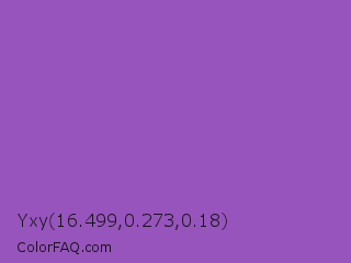 Yxy 16.499,0.273,0.18 Color is a normal purple color and the nearest color is Deep Lilac #9955bb. Hex code #9754bd and RGB value is rgb(151,84,189). In RGB color space, this color is composed of 59% red, 33% green, 74% blue, In CMYK color space, this color is composed of 20% cyan, 56% magenta, 0% yellow , 26% black , In HSL color space, this color has a hue angle of 278° , 44% saturation and 54% lightness.