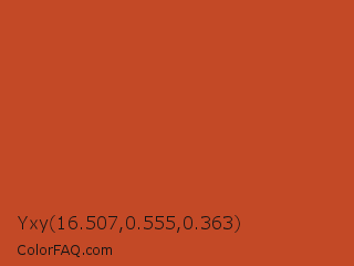 Yxy 16.507,0.555,0.363 Color is a normal red color and the nearest color is Dark Pastel Red #c23b22. Hex code #c34926 and RGB value is rgb(195,73,38). In RGB color space, this color is composed of 76% red, 29% green, 15% blue, In CMYK color space, this color is composed of 0% cyan, 63% magenta, 81% yellow , 24% black , In HSL color space, this color has a hue angle of 13° , 67% saturation and 46% lightness.