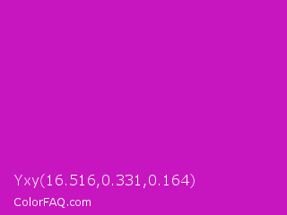 Yxy 16.516,0.331,0.164 Color is a normal magenta color and the nearest color is Deep Magenta #cc00cc. Hex code #c716bf and RGB value is rgb(199,22,191). In RGB color space, this color is composed of 78% red, 9% green, 75% blue, In CMYK color space, this color is composed of 0% cyan, 89% magenta, 4% yellow , 22% black , In HSL color space, this color has a hue angle of 303° , 80% saturation and 43% lightness.