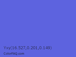 Yxy 16.527,0.201,0.149 Color is a light blue color and the nearest color is Majorelle Blue #6050dc. Hex code #5d63df and RGB value is rgb(93,99,223). In RGB color space, this color is composed of 36% red, 39% green, 87% blue, In CMYK color space, this color is composed of 58% cyan, 56% magenta, 0% yellow , 13% black , In HSL color space, this color has a hue angle of 237° , 67% saturation and 62% lightness.