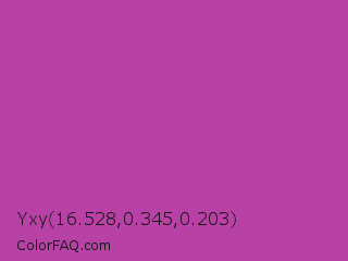 Yxy 16.528,0.345,0.203 Color is a normal magenta color and the nearest color is Byzantine #bd33a4. Hex code #b741a4 and RGB value is rgb(183,65,164). In RGB color space, this color is composed of 72% red, 25% green, 64% blue, In CMYK color space, this color is composed of 0% cyan, 64% magenta, 10% yellow , 28% black , In HSL color space, this color has a hue angle of 310° , 48% saturation and 49% lightness.