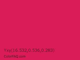 Yxy 16.532,0.536,0.283 Color is a normal rose color and the nearest color is Ruby #e0115f. Hex code #db1b57 and RGB value is rgb(219,27,87). In RGB color space, this color is composed of 86% red, 11% green, 34% blue, In CMYK color space, this color is composed of 0% cyan, 88% magenta, 60% yellow , 14% black , In HSL color space, this color has a hue angle of 341° , 78% saturation and 48% lightness.