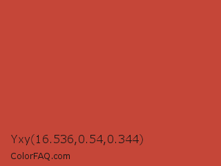 Yxy 16.536,0.54,0.344 Color is a normal red color and the nearest color is Mojo #c04737. Hex code #c54638 and RGB value is rgb(197,70,56). In RGB color space, this color is composed of 77% red, 27% green, 22% blue, In CMYK color space, this color is composed of 0% cyan, 64% magenta, 72% yellow , 23% black , In HSL color space, this color has a hue angle of 6° , 56% saturation and 50% lightness.