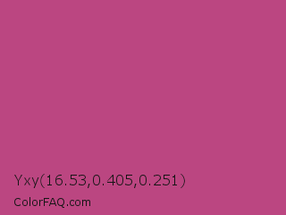 Yxy 16.53,0.405,0.251 Color is a normal rose color and the nearest color is Smitten #c84186. Hex code #bb4681 and RGB value is rgb(187,70,129). In RGB color space, this color is composed of 73% red, 27% green, 51% blue, In CMYK color space, this color is composed of 0% cyan, 63% magenta, 31% yellow , 27% black , In HSL color space, this color has a hue angle of 330° , 46% saturation and 50% lightness.