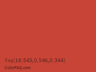 Yxy 16.543,0.546,0.344 Color is a normal red color and the nearest color is Mojo #c04737. Hex code #c74436 and RGB value is rgb(199,68,54). In RGB color space, this color is composed of 78% red, 27% green, 21% blue, In CMYK color space, this color is composed of 0% cyan, 66% magenta, 73% yellow , 22% black , In HSL color space, this color has a hue angle of 6° , 57% saturation and 50% lightness.