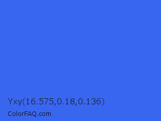 Yxy 16.575,0.18,0.136 Color is a normal blue color and the nearest color is Ultramarine Blue #4166f5. Hex code #3966ef and RGB value is rgb(57,102,239). In RGB color space, this color is composed of 22% red, 40% green, 94% blue, In CMYK color space, this color is composed of 76% cyan, 57% magenta, 0% yellow , 6% black , In HSL color space, this color has a hue angle of 225° , 85% saturation and 58% lightness.