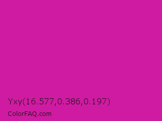 Yxy 16.577,0.386,0.197 Color is a normal magenta color and the nearest color is Royal Fuchsia #ca2c92. Hex code #cf1ba1 and RGB value is rgb(207,27,161). In RGB color space, this color is composed of 81% red, 11% green, 63% blue, In CMYK color space, this color is composed of 0% cyan, 87% magenta, 22% yellow , 19% black , In HSL color space, this color has a hue angle of 315° , 77% saturation and 46% lightness.
