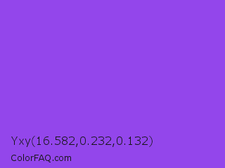 Yxy 16.582,0.232,0.132 Color is a normal violet color and the nearest color is Navy Purple #9457eb. Hex code #9346eb and RGB value is rgb(147,70,235). In RGB color space, this color is composed of 58% red, 27% green, 92% blue, In CMYK color space, this color is composed of 37% cyan, 70% magenta, 0% yellow , 8% black , In HSL color space, this color has a hue angle of 268° , 80% saturation and 60% lightness.
