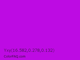 Yxy 16.582,0.278,0.132 Color is a normal purple color and the nearest color is Vivid Mulberry #b80ce3. Hex code #bd0be3 and RGB value is rgb(189,11,227). In RGB color space, this color is composed of 74% red, 4% green, 89% blue, In CMYK color space, this color is composed of 17% cyan, 95% magenta, 0% yellow , 11% black , In HSL color space, this color has a hue angle of 289° , 91% saturation and 47% lightness.