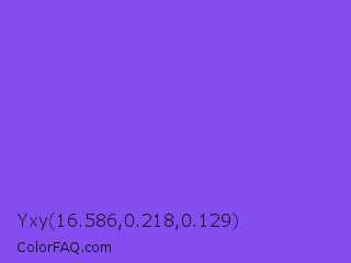 Yxy 16.586,0.218,0.129 Color is a light violet color and the nearest color is Navy Purple #9457eb. Hex code #854df0 and RGB value is rgb(133,77,240). In RGB color space, this color is composed of 52% red, 30% green, 94% blue, In CMYK color space, this color is composed of 45% cyan, 68% magenta, 0% yellow , 6% black , In HSL color space, this color has a hue angle of 261° , 84% saturation and 62% lightness.