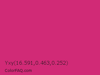 Yxy 16.591,0.463,0.252 Color is a normal rose color and the nearest color is Telemagenta #cf3476. Hex code #d12a76 and RGB value is rgb(209,42,118). In RGB color space, this color is composed of 82% red, 16% green, 46% blue, In CMYK color space, this color is composed of 0% cyan, 80% magenta, 44% yellow , 18% black , In HSL color space, this color has a hue angle of 333° , 67% saturation and 49% lightness.