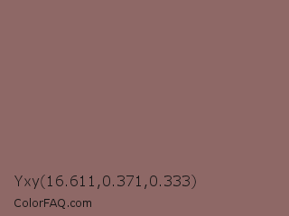 Yxy 16.611,0.371,0.333 Color is a normal red color and the nearest color is Copper Rose #996666. Hex code #8e6866 and RGB value is rgb(142,104,102). In RGB color space, this color is composed of 56% red, 41% green, 40% blue, In CMYK color space, this color is composed of 0% cyan, 27% magenta, 28% yellow , 44% black , In HSL color space, this color has a hue angle of 3° , 16% saturation and 48% lightness.