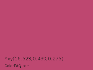 Yxy 16.623,0.439,0.276 Color is a normal rose color and the nearest color is Fuchsia Rose #c74375. Hex code #be4770 and RGB value is rgb(190,71,112). In RGB color space, this color is composed of 75% red, 28% green, 44% blue, In CMYK color space, this color is composed of 0% cyan, 63% magenta, 41% yellow , 25% black , In HSL color space, this color has a hue angle of 339° , 48% saturation and 51% lightness.