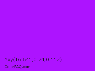 Yxy 16.641,0.24,0.112 Color is a normal purple color and the nearest color is Vivid Violet #9f00ff. Hex code #ad13ff and RGB value is rgb(173,19,255). In RGB color space, this color is composed of 68% red, 7% green, 100% blue, In CMYK color space, this color is composed of 32% cyan, 93% magenta, 0% yellow , 0% black , In HSL color space, this color has a hue angle of 279° , 100% saturation and 54% lightness.