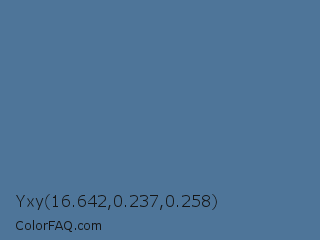 Yxy 16.642,0.237,0.258 Color is a normal blue color and the nearest color is Kashmir Blue #507096. Hex code #4e7599 and RGB value is rgb(78,117,153). In RGB color space, this color is composed of 31% red, 46% green, 60% blue, In CMYK color space, this color is composed of 49% cyan, 24% magenta, 0% yellow , 40% black , In HSL color space, this color has a hue angle of 209° , 32% saturation and 45% lightness.