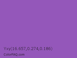 Yxy 16.657,0.274,0.186 Color is a normal purple color and the nearest color is Deep Lilac #9955bb. Hex code #9457ba and RGB value is rgb(148,87,186). In RGB color space, this color is composed of 58% red, 34% green, 73% blue, In CMYK color space, this color is composed of 20% cyan, 53% magenta, 0% yellow , 27% black , In HSL color space, this color has a hue angle of 277° , 42% saturation and 54% lightness.