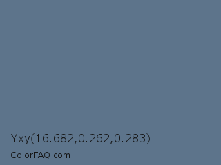 Yxy 16.682,0.262,0.283 Color is a normal blue color and the nearest color is Smalt Blue #51808f. Hex code #5d748b and RGB value is rgb(93,116,139). In RGB color space, this color is composed of 36% red, 45% green, 55% blue, In CMYK color space, this color is composed of 33% cyan, 17% magenta, 0% yellow , 45% black , In HSL color space, this color has a hue angle of 210° , 20% saturation and 45% lightness.