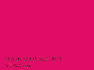 Yxy 16.693,0.52,0.267 Color is a normal rose color and the nearest color is Ruby #e0115f. Hex code #de0c63 and RGB value is rgb(222,12,99). In RGB color space, this color is composed of 87% red, 5% green, 39% blue, In CMYK color space, this color is composed of 0% cyan, 95% magenta, 55% yellow , 13% black , In HSL color space, this color has a hue angle of 335° , 90% saturation and 46% lightness.