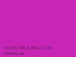 Yxy 16.706,0.341,0.176 Color is a normal magenta color and the nearest color is Byzantine #bd33a4. Hex code #c625b6 and RGB value is rgb(198,37,182). In RGB color space, this color is composed of 78% red, 15% green, 71% blue, In CMYK color space, this color is composed of 0% cyan, 81% magenta, 8% yellow , 22% black , In HSL color space, this color has a hue angle of 306° , 69% saturation and 46% lightness.