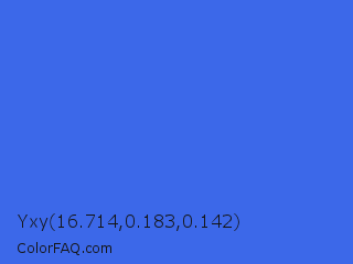 Yxy 16.714,0.183,0.142 Color is a normal blue color and the nearest color is Royal Blue #4169e1. Hex code #3c68e9 and RGB value is rgb(60,104,233). In RGB color space, this color is composed of 24% red, 41% green, 91% blue, In CMYK color space, this color is composed of 74% cyan, 55% magenta, 0% yellow , 9% black , In HSL color space, this color has a hue angle of 225° , 80% saturation and 57% lightness.