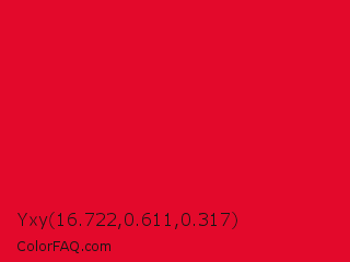 Yxy 16.722,0.611,0.317 Color is a normal red color and the nearest color is Medium Candy Apple Red #e2062c. Hex code #e3092b and RGB value is rgb(227,9,43). In RGB color space, this color is composed of 89% red, 4% green, 17% blue, In CMYK color space, this color is composed of 0% cyan, 96% magenta, 81% yellow , 11% black , In HSL color space, this color has a hue angle of 351° , 92% saturation and 46% lightness.