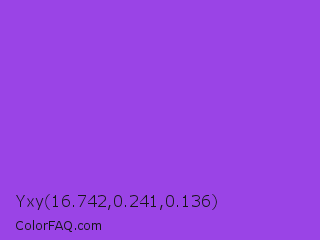 Yxy 16.742,0.241,0.136 Color is a normal purple color and the nearest color is Navy Purple #9457eb. Hex code #9a44e6 and RGB value is rgb(154,68,230). In RGB color space, this color is composed of 60% red, 27% green, 90% blue, In CMYK color space, this color is composed of 33% cyan, 70% magenta, 0% yellow , 10% black , In HSL color space, this color has a hue angle of 272° , 76% saturation and 58% lightness.