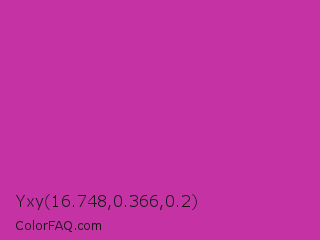 Yxy 16.748,0.366,0.2 Color is a normal magenta color and the nearest color is Byzantine #bd33a4. Hex code #c432a3 and RGB value is rgb(196,50,163). In RGB color space, this color is composed of 77% red, 20% green, 64% blue, In CMYK color space, this color is composed of 0% cyan, 74% magenta, 17% yellow , 23% black , In HSL color space, this color has a hue angle of 314° , 59% saturation and 48% lightness.