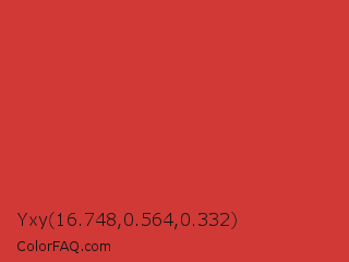 Yxy 16.748,0.564,0.332 Color is a normal red color and the nearest color is Madder Lake #cc3336. Hex code #d13936 and RGB value is rgb(209,57,54). In RGB color space, this color is composed of 82% red, 22% green, 21% blue, In CMYK color space, this color is composed of 0% cyan, 73% magenta, 74% yellow , 18% black , In HSL color space, this color has a hue angle of 1° , 63% saturation and 52% lightness.