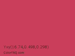 Yxy 16.74,0.498,0.298 Color is a normal red color and the nearest color is Brick Red #cb4154. Hex code #ca3e5a and RGB value is rgb(202,62,90). In RGB color space, this color is composed of 79% red, 24% green, 35% blue, In CMYK color space, this color is composed of 0% cyan, 69% magenta, 55% yellow , 21% black , In HSL color space, this color has a hue angle of 348° , 57% saturation and 52% lightness.