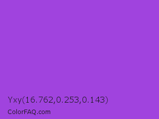 Yxy 16.762,0.253,0.143 Color is a normal purple color and the nearest color is Dark Orchid #9932cc. Hex code #a043de and RGB value is rgb(160,67,222). In RGB color space, this color is composed of 63% red, 26% green, 87% blue, In CMYK color space, this color is composed of 28% cyan, 70% magenta, 0% yellow , 13% black , In HSL color space, this color has a hue angle of 276° , 70% saturation and 57% lightness.