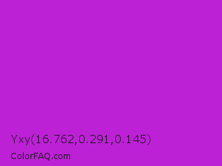 Yxy 16.762,0.291,0.145 Color is a normal magenta color and the nearest color is Vivid Mulberry #b80ce3. Hex code #bd21d6 and RGB value is rgb(189,33,214). In RGB color space, this color is composed of 74% red, 13% green, 84% blue, In CMYK color space, this color is composed of 12% cyan, 85% magenta, 0% yellow , 16% black , In HSL color space, this color has a hue angle of 292° , 73% saturation and 48% lightness.