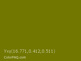 Yxy 16.771,0.412,0.511 Color is a dark yellow color and the nearest color is Bronze Yellow #737000. Hex code #727700 and RGB value is rgb(114,119,0). In RGB color space, this color is composed of 45% red, 47% green, 0% blue, In CMYK color space, this color is composed of 4% cyan, 0% magenta, 100% yellow , 53% black , In HSL color space, this color has a hue angle of 63° , 100% saturation and 23% lightness.
