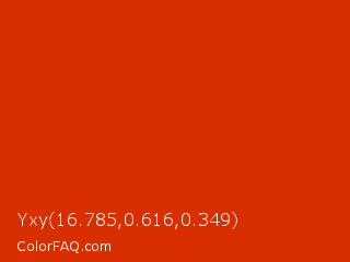 Yxy 16.785,0.616,0.349 Color is a normal red color and the nearest color is Grenadier #d54600. Hex code #d92f00 and RGB value is rgb(217,47,0). In RGB color space, this color is composed of 85% red, 18% green, 0% blue, In CMYK color space, this color is composed of 0% cyan, 78% magenta, 100% yellow , 15% black , In HSL color space, this color has a hue angle of 13° , 100% saturation and 43% lightness.