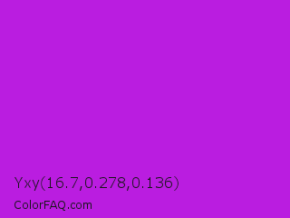 Yxy 16.7,0.278,0.136 Color is a normal purple color and the nearest color is Vivid Mulberry #b80ce3. Hex code #ba1de0 and RGB value is rgb(186,29,224). In RGB color space, this color is composed of 73% red, 11% green, 88% blue, In CMYK color space, this color is composed of 17% cyan, 87% magenta, 0% yellow , 12% black , In HSL color space, this color has a hue angle of 288° , 77% saturation and 50% lightness.