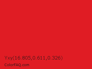 Yxy 16.805,0.611,0.326 Color is a normal red color and the nearest color is Lust #e62020. Hex code #e01c24 and RGB value is rgb(224,28,36). In RGB color space, this color is composed of 88% red, 11% green, 14% blue, In CMYK color space, this color is composed of 0% cyan, 88% magenta, 84% yellow , 12% black , In HSL color space, this color has a hue angle of 358° , 78% saturation and 49% lightness.