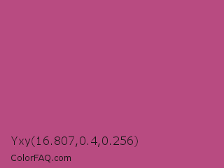 Yxy 16.807,0.4,0.256 Color is a normal rose color and the nearest color is Mystic Maroon #ad4379. Hex code #b84b81 and RGB value is rgb(184,75,129). In RGB color space, this color is composed of 72% red, 29% green, 51% blue, In CMYK color space, this color is composed of 0% cyan, 59% magenta, 30% yellow , 28% black , In HSL color space, this color has a hue angle of 330° , 43% saturation and 51% lightness.