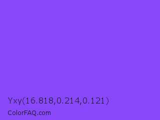 Yxy 16.818,0.214,0.121 Color is a light violet color and the nearest color is Navy Purple #9457eb. Hex code #8848fa and RGB value is rgb(136,72,250). In RGB color space, this color is composed of 53% red, 28% green, 98% blue, In CMYK color space, this color is composed of 46% cyan, 71% magenta, 0% yellow , 2% black , In HSL color space, this color has a hue angle of 262° , 95% saturation and 63% lightness.