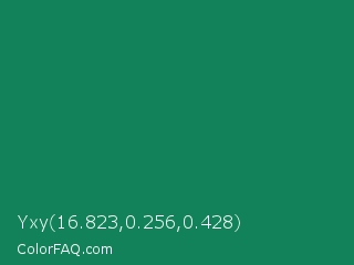 Yxy 16.823,0.256,0.428 Color is a dark green color and the nearest color is Deep Green Cyan Turquoise #0e7c61. Hex code #11825a and RGB value is rgb(17,130,90). In RGB color space, this color is composed of 7% red, 51% green, 35% blue, In CMYK color space, this color is composed of 87% cyan, 0% magenta, 31% yellow , 49% black , In HSL color space, this color has a hue angle of 159° , 77% saturation and 29% lightness.