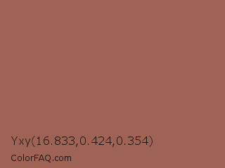 Yxy 16.833,0.424,0.354 Color is a normal red color and the nearest color is Redwood #a45a52. Hex code #9e6354 and RGB value is rgb(158,99,84). In RGB color space, this color is composed of 62% red, 39% green, 33% blue, In CMYK color space, this color is composed of 0% cyan, 37% magenta, 47% yellow , 38% black , In HSL color space, this color has a hue angle of 12° , 31% saturation and 47% lightness.