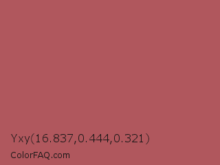 Yxy 16.837,0.444,0.321 Color is a normal red color and the nearest color is Matrix #b05d54. Hex code #b0575d and RGB value is rgb(176,87,93). In RGB color space, this color is composed of 69% red, 34% green, 36% blue, In CMYK color space, this color is composed of 0% cyan, 51% magenta, 47% yellow , 31% black , In HSL color space, this color has a hue angle of 356° , 36% saturation and 52% lightness.