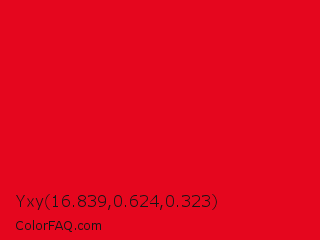 Yxy 16.839,0.624,0.323 Color is a normal red color and the nearest color is Cadmium Red #e30022. Hex code #e5061e and RGB value is rgb(229,6,30). In RGB color space, this color is composed of 90% red, 2% green, 12% blue, In CMYK color space, this color is composed of 0% cyan, 97% magenta, 87% yellow , 10% black , In HSL color space, this color has a hue angle of 354° , 95% saturation and 46% lightness.