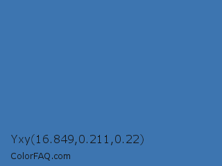 Yxy 16.849,0.211,0.22 Color is a normal blue color and the nearest color is San Marino #456cac. Hex code #3d75b0 and RGB value is rgb(61,117,176). In RGB color space, this color is composed of 24% red, 46% green, 69% blue, In CMYK color space, this color is composed of 65% cyan, 34% magenta, 0% yellow , 31% black , In HSL color space, this color has a hue angle of 211° , 49% saturation and 46% lightness.