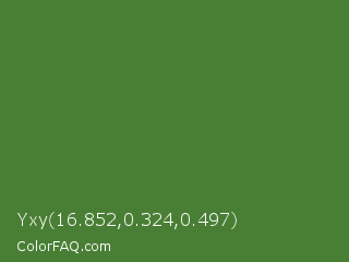 Yxy 16.852,0.324,0.497 Color is a normal green color and the nearest color is Sap Green #507d2a. Hex code #497f35 and RGB value is rgb(73,127,53). In RGB color space, this color is composed of 29% red, 50% green, 21% blue, In CMYK color space, this color is composed of 43% cyan, 0% magenta, 58% yellow , 50% black , In HSL color space, this color has a hue angle of 104° , 41% saturation and 35% lightness.