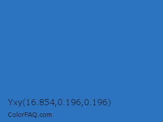 Yxy 16.854,0.196,0.196 Color is a normal blue color and the nearest color is Mariner #286acd. Hex code #2d74c0 and RGB value is rgb(45,116,192). In RGB color space, this color is composed of 18% red, 45% green, 75% blue, In CMYK color space, this color is composed of 77% cyan, 40% magenta, 0% yellow , 25% black , In HSL color space, this color has a hue angle of 211° , 62% saturation and 46% lightness.