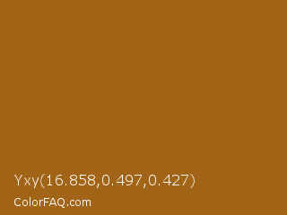 Yxy 16.858,0.497,0.427 Color is a normal orange color and the nearest color is Reno Sand #a86515. Hex code #a26416 and RGB value is rgb(162,100,22). In RGB color space, this color is composed of 64% red, 39% green, 9% blue, In CMYK color space, this color is composed of 0% cyan, 38% magenta, 86% yellow , 36% black , In HSL color space, this color has a hue angle of 33° , 76% saturation and 36% lightness.