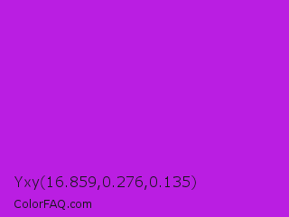 Yxy 16.859,0.276,0.135 Color is a normal purple color and the nearest color is Vivid Mulberry #b80ce3. Hex code #ba1ee2 and RGB value is rgb(186,30,226). In RGB color space, this color is composed of 73% red, 12% green, 89% blue, In CMYK color space, this color is composed of 18% cyan, 87% magenta, 0% yellow , 11% black , In HSL color space, this color has a hue angle of 288° , 77% saturation and 50% lightness.