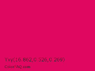 Yxy 16.862,0.526,0.269 Color is a normal rose color and the nearest color is Raspberry #e30b5d. Hex code #e00761 and RGB value is rgb(224,7,97). In RGB color space, this color is composed of 88% red, 3% green, 38% blue, In CMYK color space, this color is composed of 0% cyan, 97% magenta, 57% yellow , 12% black , In HSL color space, this color has a hue angle of 335° , 94% saturation and 45% lightness.