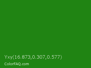 Yxy 16.873,0.307,0.577 Color is a dark green color and the nearest color is Forest Green #228b22. Hex code #208413 and RGB value is rgb(32,132,19). In RGB color space, this color is composed of 13% red, 52% green, 7% blue, In CMYK color space, this color is composed of 76% cyan, 0% magenta, 86% yellow , 48% black , In HSL color space, this color has a hue angle of 113° , 75% saturation and 30% lightness.